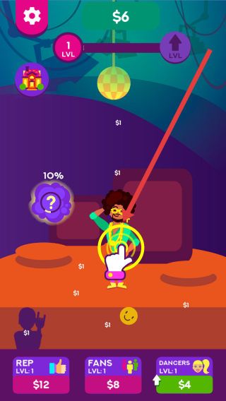1、游戏初始界面,用手指点击屏幕中人物身上的【黄色圆圈】区域,开始积累游戏资金。
