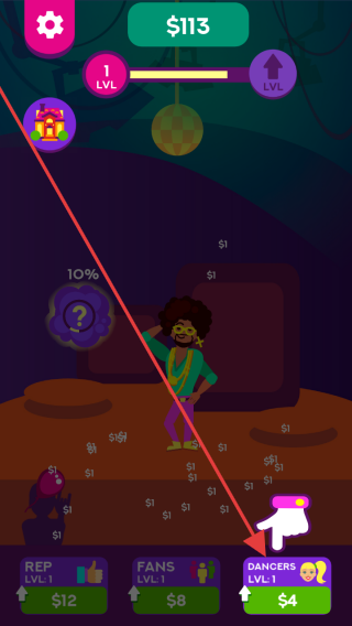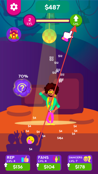 3、当积累资金达到一定程度,看到【LVL】升级提示时,点击升级标志,提升游戏等级获取更多收益。