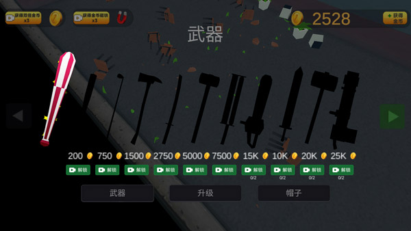 1、点击武器界面,通过消耗金币,可以解锁各种强大的武器。