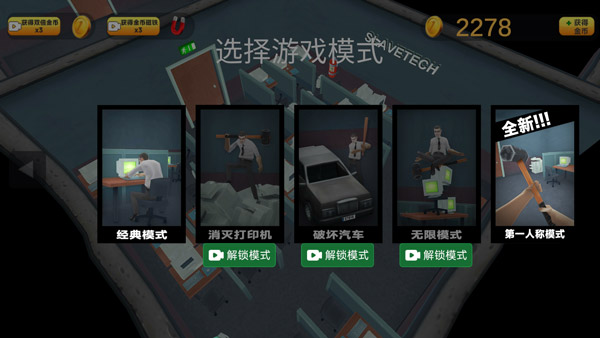 选择你喜欢的挑战游戏模式:经典模式、消灭打印机、破坏汽车、无线模式或第一人称模式。