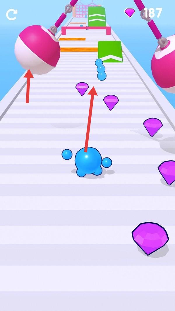 3、同时,收集道路上的【紫色钻石】,提升分数,朝着终点方向行进。