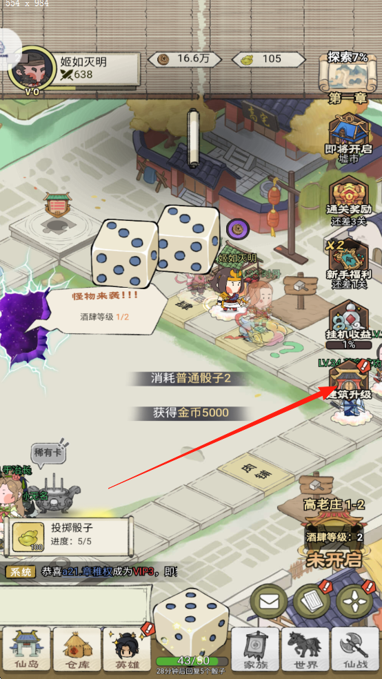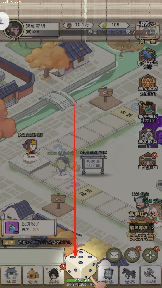 2、自动闯关挂机:角色自动掷骰子闯关,无需频繁操作,挂机期间可持续获得收益,离线回归可领取丰厚修炼奖励,轻松兼顾休闲与成长。