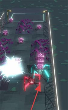 2、场景中有紫色、绿色的方块等障碍,玩家需操控角色撞击或使用技能清除这些障碍,为前进开辟道路。