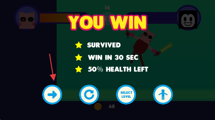 3、战斗胜利后,点击左下角右箭头按钮,可继续下一关或进入新的游戏环节。