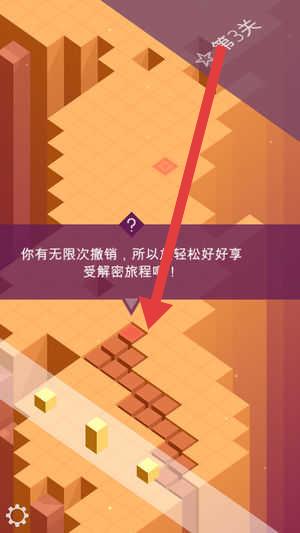 1、进入游玩关卡,按箭头指示,观察场景布局,利用“无限次撤销”的优势,规划方块移动路径,朝着关卡目标推进。