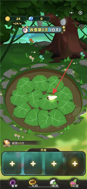 1、进入养蚕界面,可看到“养蚕第0天(白天)”等状态,点击桑叶上的蚕进行互动,开启养蚕流程。