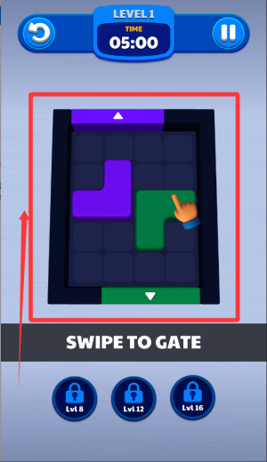 1、基础操作,玩家通过触摸滑动屏幕控制方块移动方向,将同色方块引导至对应颜色的出口位置完成消除。