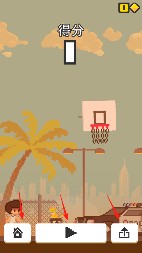 3、成功投篮后,可查看得分情况。此时,点击左下角房子图标【返回主界面】,点击中间播放按钮图标重新开始游戏。
