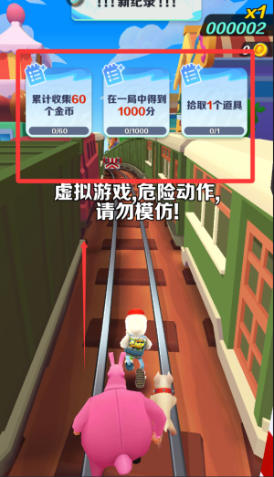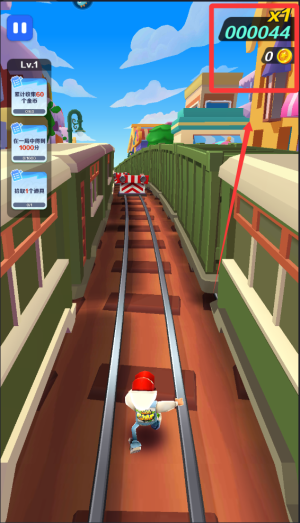1、基础玩法,玩家通过滑动屏幕控制滑板小子的移动方向,躲避迎面而来的火车,同时收集金币和道具,尽可能地跑得更远。