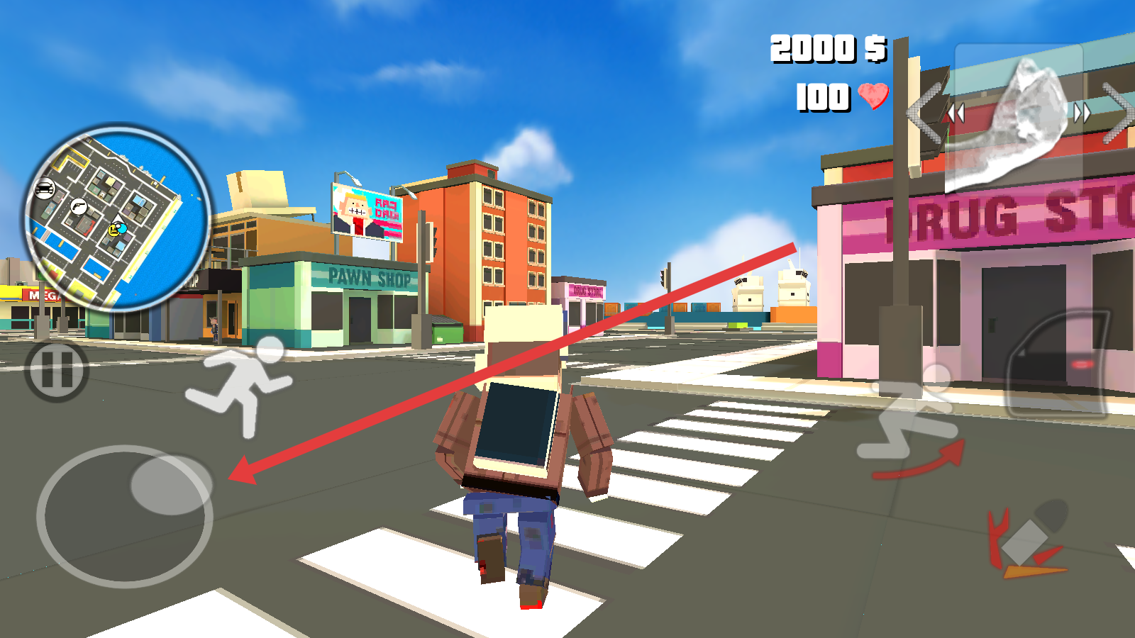 2、进入游玩场景,按箭头指向,利用左下角的虚拟摇杆控制角色移动,熟悉操作手感,在城市街道中探索。