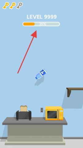 2、操控水瓶沿红色箭头方向移动,避开下方的烤面包机和微波炉等物体,持续推进关卡。