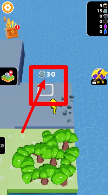 3.新区域需消耗特定资源才能建造,例如采集30个石头才能修复岛屿路径,采集量可实时查看并控制进度。