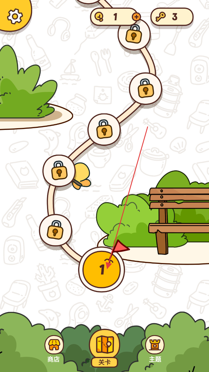 1、进入关卡界面,点击带数字“1”的黄色圆形图标,开启Level1找物挑战。