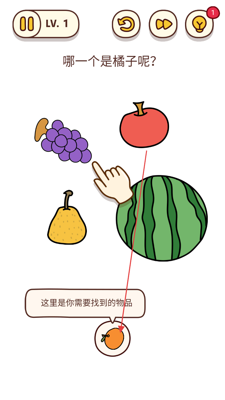 2、在题目界面(如LV.1),依据提示“哪一个是橘子呢”,从葡萄、苹果等物品中找出橘子并点击。