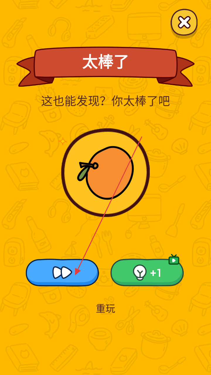 3、成功找到物品后,在通关界面点击蓝色“重玩”或绿色带灯泡按钮,可选择重玩或获取提示,继续游戏。