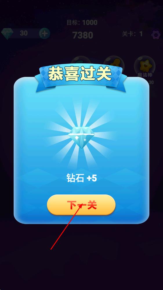 1.选择经典模式开启首关,屏幕中随机分布不同颜色星星,点击两个及以上相同颜色星星即可消除,积累分数达到目标值即可过关。