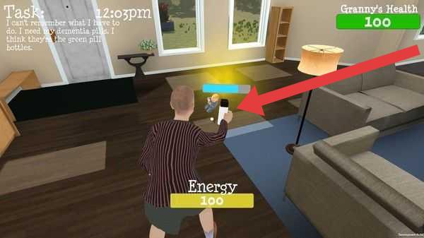 1、在家庭场景,按箭头指示,与目标互动,完成“找药”等基础任务,注意角色精力。