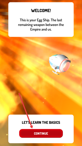1、点击“CONTINUE”,开启推测为太空题材的EggShip游戏新手教学。