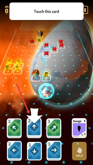 2、按界面提示触摸指定蓝色箭头卡片,学习角色移动、指令触发等基础操作。