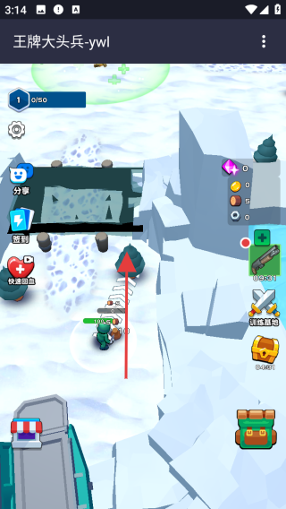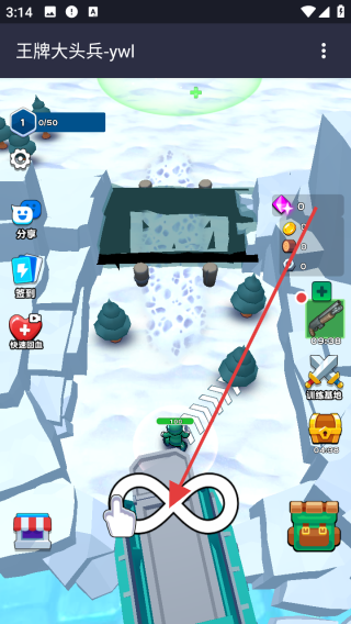 1、进入王牌大头兵游戏场景,跟随手指指引滑动“∞”按钮,操控角色沿轨道移动,探索雪地地图。