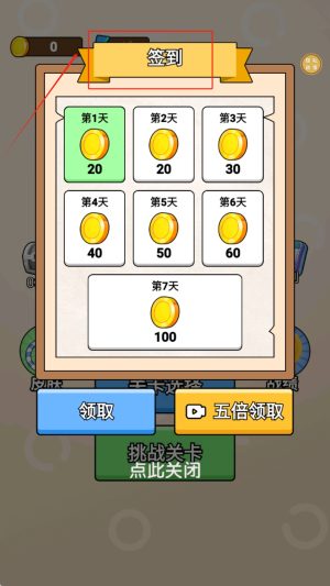 1、每日登录游戏后点击主界面右侧签到按钮,查看7日连续签到奖励,选择普通领取或观看广告获取五倍金币。