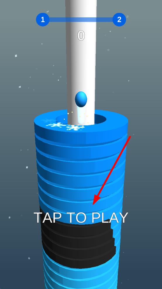 1、进入游戏后,点击屏幕“TAP TO PLAY”,操控蓝色小球开始下落挑战,准备穿透堆叠平台。