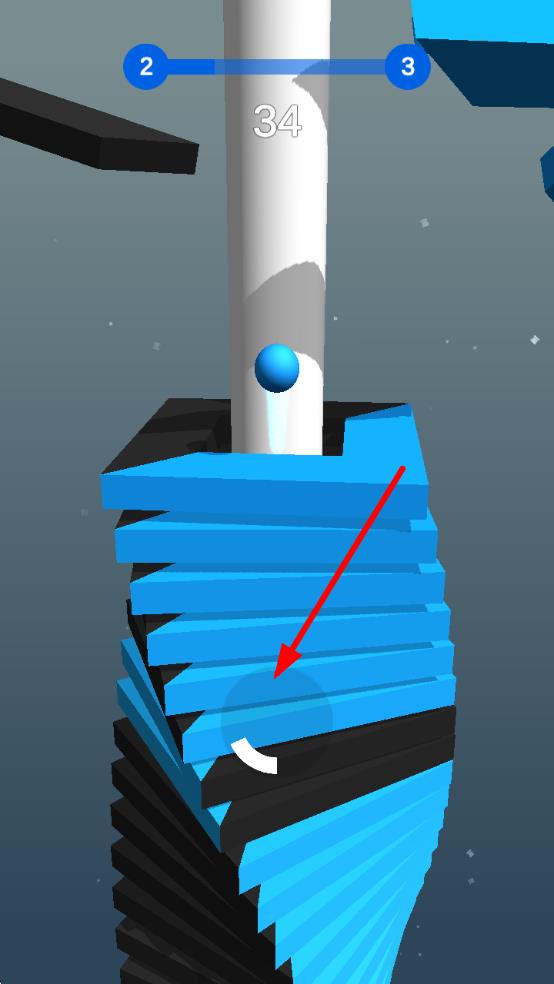 2、在小球下落过程中,看准蓝色平台区域,点击屏幕让小球穿透,避开黑色障碍,持续向下闯关。