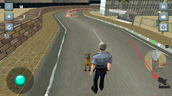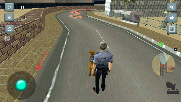 2、操控左下角绿色圆形按钮,控制警察与警犬在道路移动,躲避障碍,推进任务。