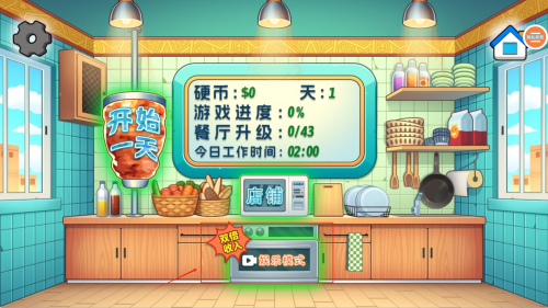 1、在游戏初始界面点击开始一天按钮,进入餐厅经营模式,查看当前金币数量和升级进度准备开始营业。