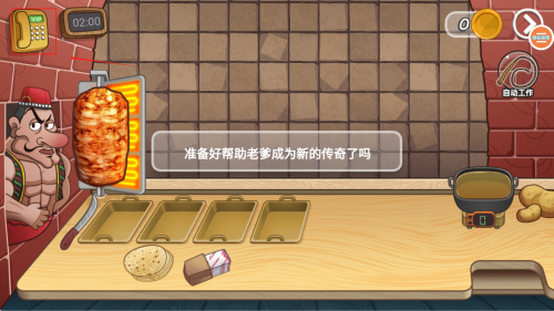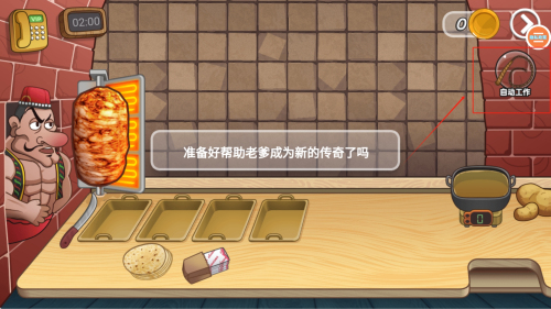3、点击自动工作按钮启动辅助模式,系统会自动完成基础烤肉流程,玩家可专注处理订单和食材补充。