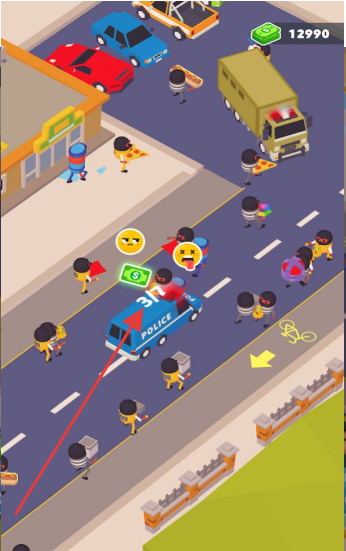 1、操控警车在街道行驶,撞击、抓捕罪犯(如持披萨、武器的角色),获取金币奖励。