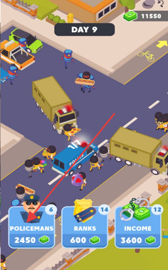 2、收集场景中的美元符号道具,积累金币,用于升级“POLICEMANS(警力)”“RANKS(等级)”“INCOME(收益)”等。