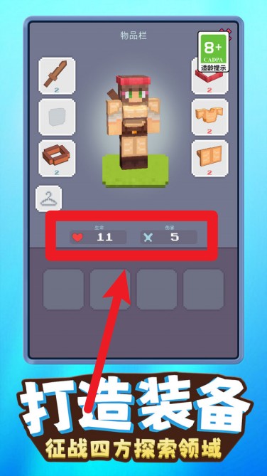 2.进入物品栏界面可以自由装备道具与盔甲,不同装备将影响你的生命值与攻击伤害输出。
