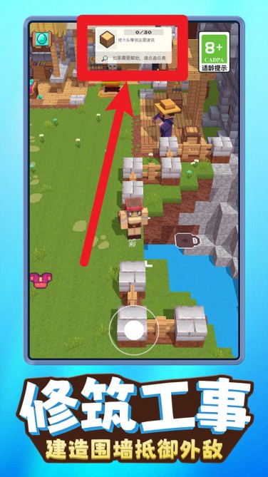 3.屏幕上方显示任务进度为“0/30”,代表你需搬运30个木箱才能完成当前的修建目标任务。