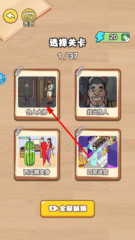 1、进入游戏点击“开始游戏”,跳转关卡选择页,挑选想挑战的关卡,如首关“伪人大师”。