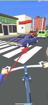 2、骑行遇路口,按箭头提示,观察交通,小心避让紫色汽车等,平稳通过斑马线,继续送餐行程。