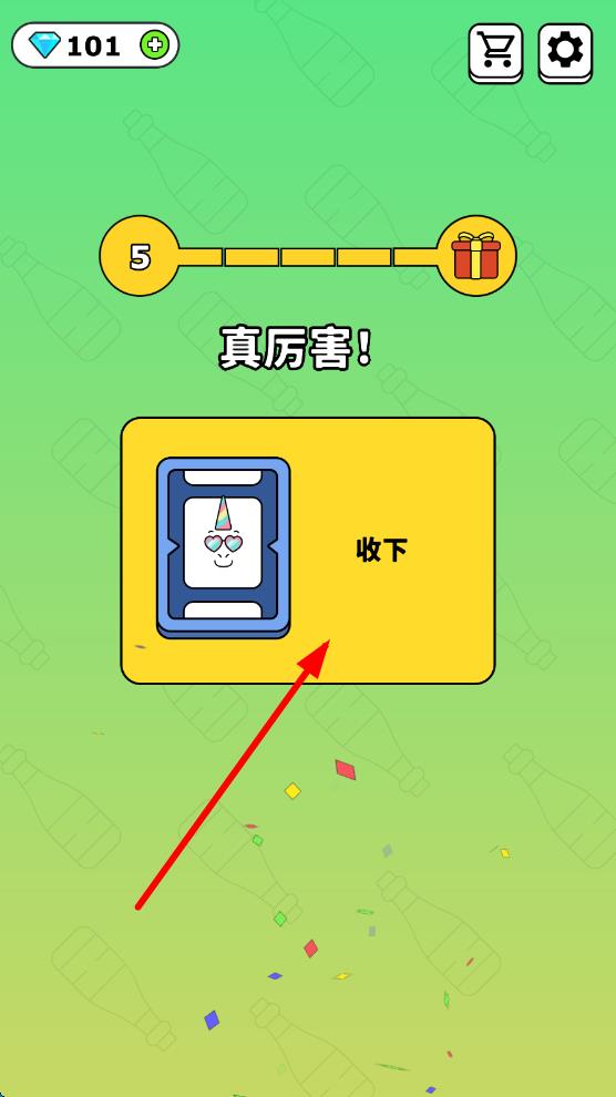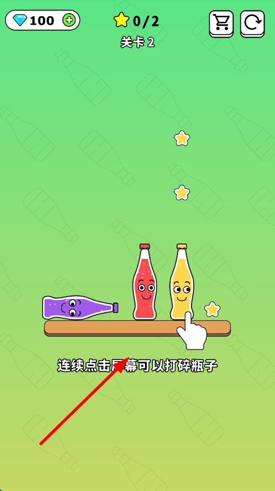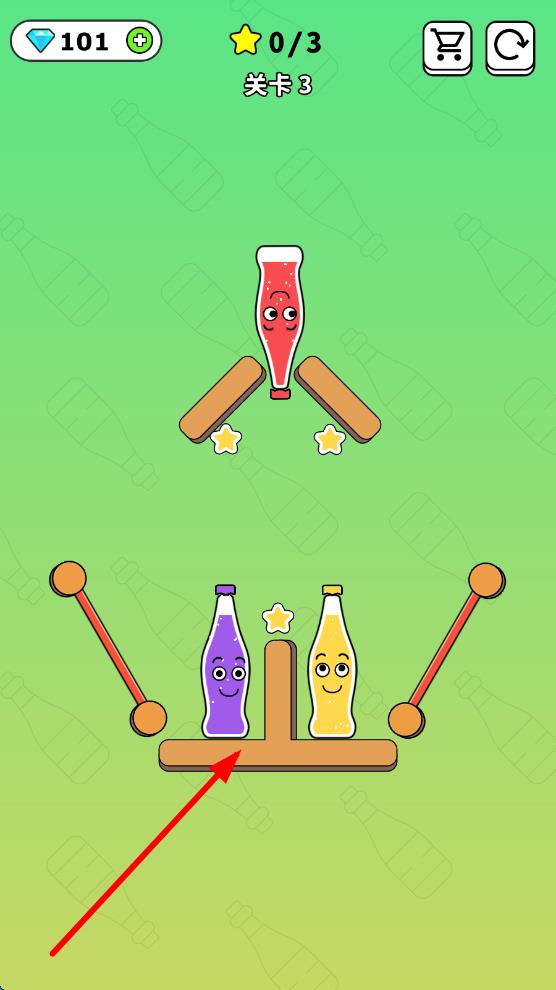 1、进入关卡后,点击啤酒瓶并按住屏幕蓄力,观察抛物线轨迹预判落点,调整角度使瓶盖上的颜色对准场景中的同色星星,松开手指释放瓶盖。