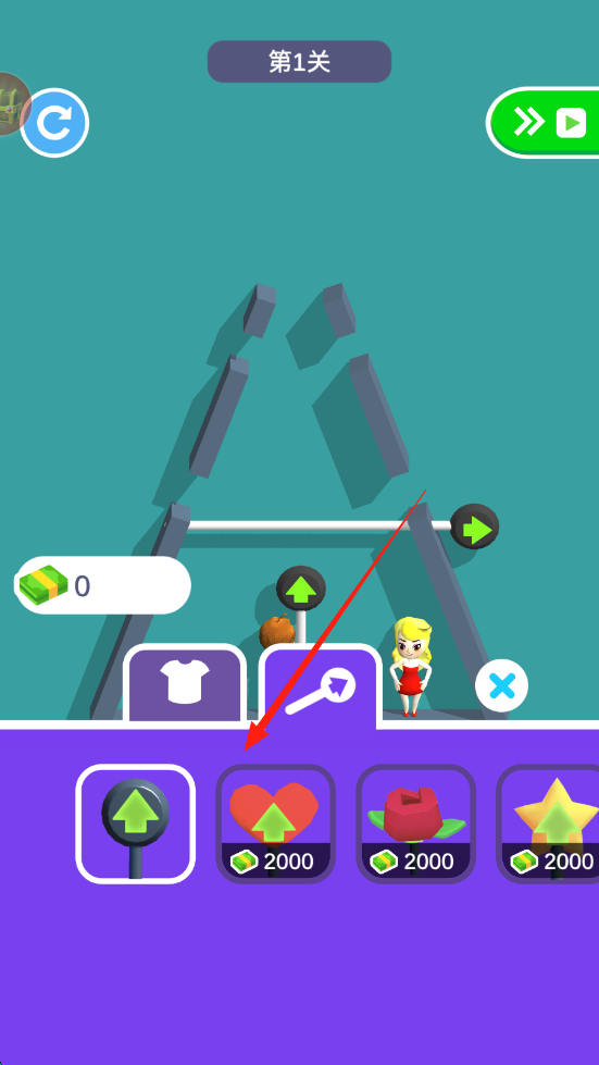 3、点击购买道具,用金币解锁助力物品,放置到关卡合适位置,辅助人物通关。