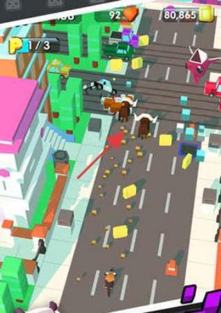 3、闯关推进:角色(如牛)奔跑,积累分数(80,865),完成关卡目标(P1/3)。