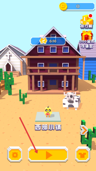 1、小镇界面:点击黄色箭头开始,场景含木屋、奶牛、仙人掌,初始金币0。