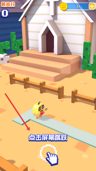 2、基础操作:角色(黄鸡)在跑道,点击屏幕触发跳跃,躲避障碍。