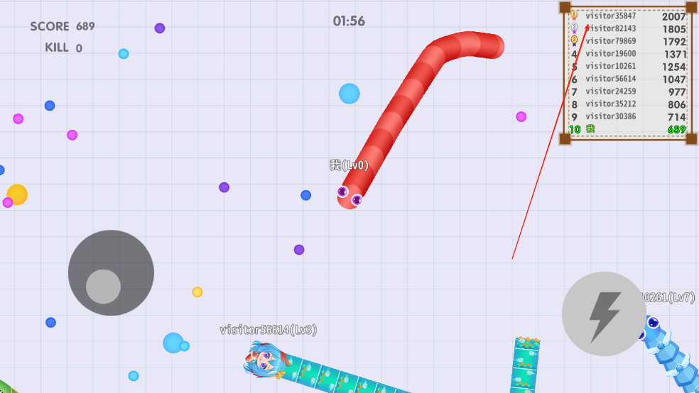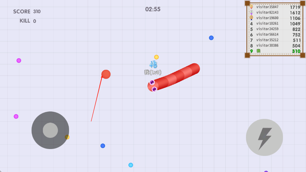 2、遇到其他贪吃蛇时,可绕后吞噬其尾部光点,同时要避开对方头部碰撞,利用加速键快速躲闪。