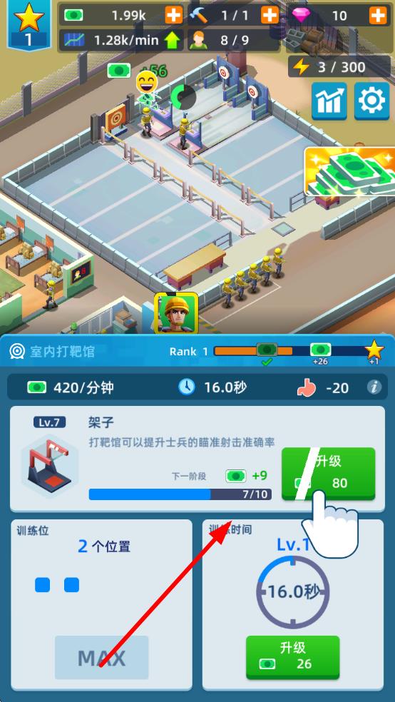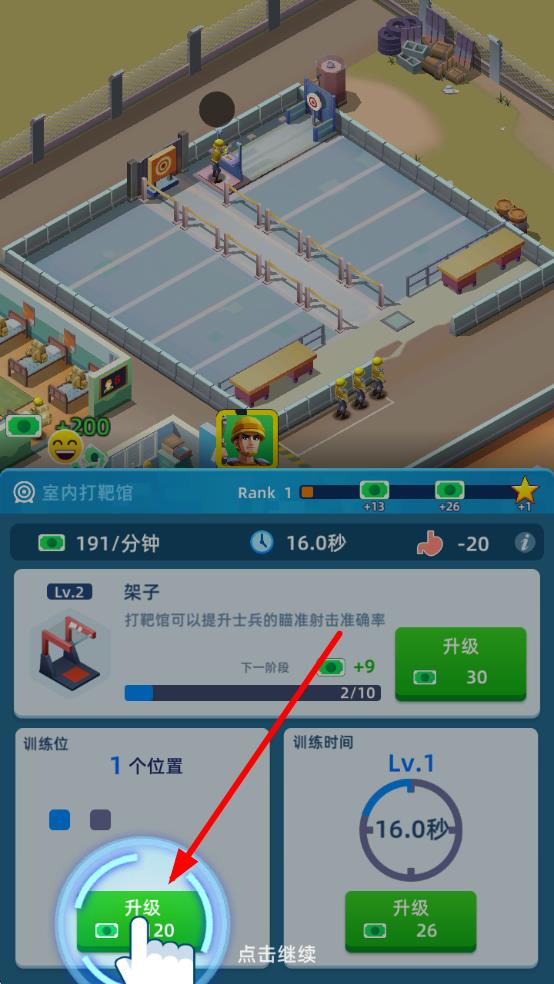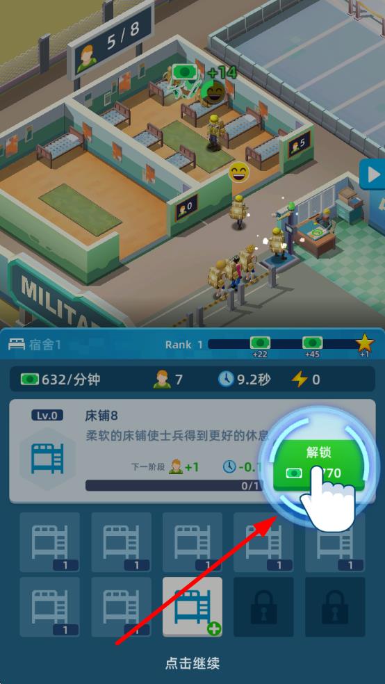 1、进入游戏,面对军营初始布局,点击建筑(如宿舍、打靶馆)对应的解锁、升级按钮,开启建设。