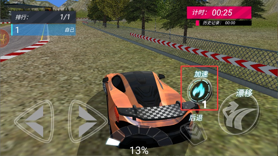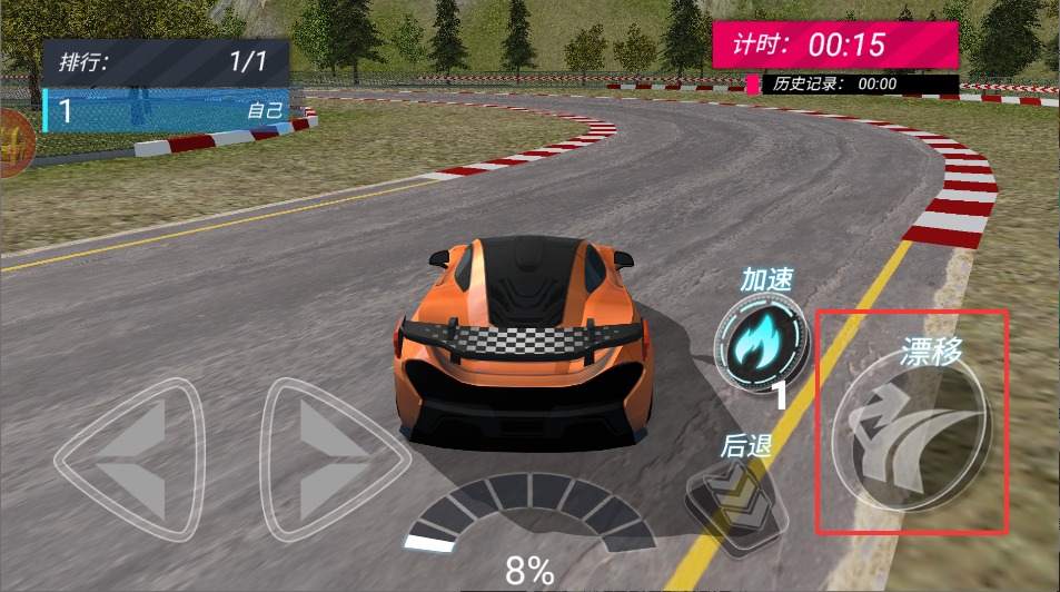 2、点击漂移键让车身横向滑动,保持适当角度完成高速过弯,同时注意控制方向避免撞墙减速。