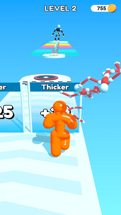 1、物理引擎表现独特,橡皮人角色拥有夸张的弹性变形效果。奔跑、跳跃和碰撞时会产生滑稽的形变反应。