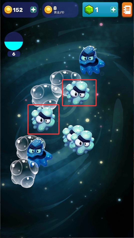 2、将两个相同等级的生物向相反方向滑动,成功碰撞后即可合成为高阶形态,每次进化都能提升金币产出效率。