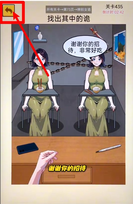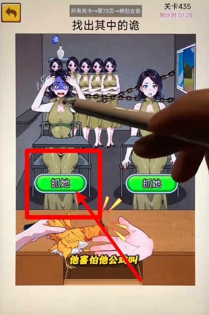 1.面对多个外貌相同的角色,仔细观察细节破绽,点击“抓她”按钮识别真正伪装者成功过关。