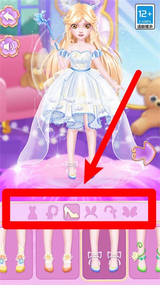 1.点击鞋子图标可切换鞋类样式,自由选择不同风格的高跟鞋、凉鞋或童话靴来搭配整体造型。