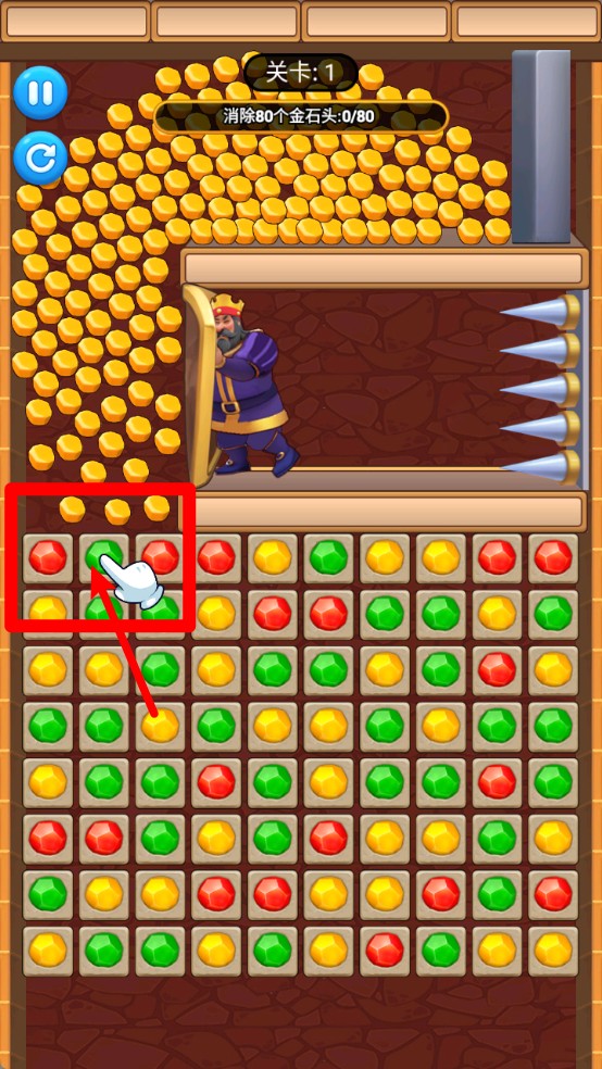 2.点击相同颜色的宝石图案进行消除,集满指定数量金石头后可打通道路释放金币完成当前任务目标。