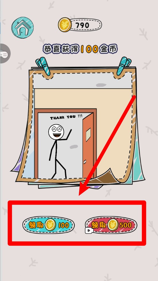 2.通关后选择金币领取方式,点击右侧按钮观看广告可领取更多金币奖励,收益翻倍更划算。